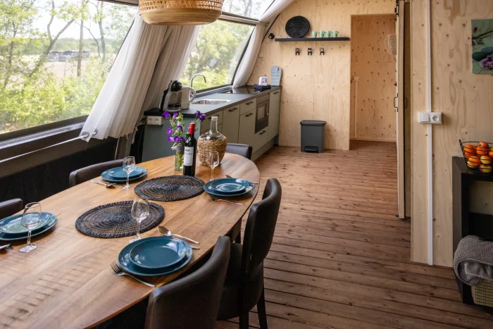 Die Meerzicht Lodge bietet Platz für 4 Personen. Damit ist sie perfekt für die ganze Familie oder für ein Paar, das gerne mehr Raum zur Verfügung hat. Schon beim Reinkommen fällt direkt der Panoramablick auf den See auf. Ein weiterer Vorteil: durch die Fenster kommt viel Licht rein. Zusammen mit der hohen Decke gibt dies ein schönes Raumgefühl. Von der offenen Küche aus blicken Sie zudem über die für Drenthe typischen Wiesen, auf denen die Pferde grasen.